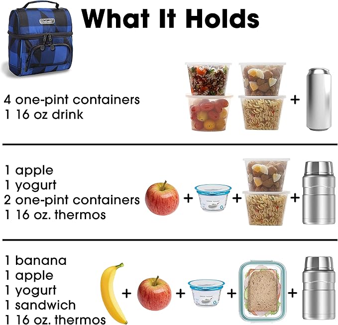 - What It Holds — Insulated lunch box holds a 12-16 oz drink, a yogurt cup, a fruit cup, a small cottage cheese container, an apple, and 2 frozen gel packs