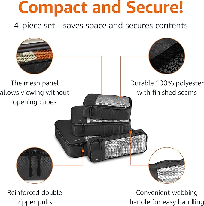 Amazon Basics Lightweight Packing Cubes Travel Organizer Set with Double Zipper, Mesh Top, Small, Medium, Large, Slim, Black, 4 Piece