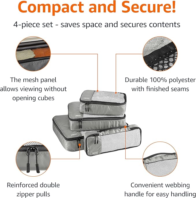 Amazon Basics Lightweight Packing Cubes Travel Organizer Set with Double Zipper, Mesh Top, Multiple Sizes, 4 Piece, Gray