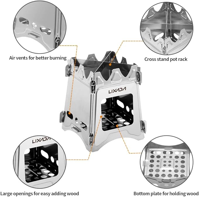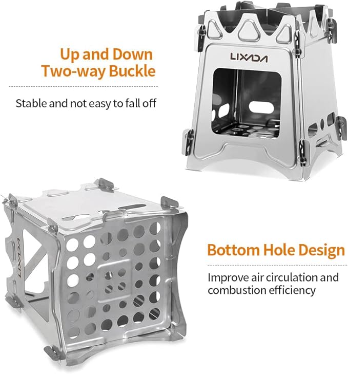 - 🔥【Sturdy & Rust-proof Material】- We are committed to providing you with quality products, the stainless steel construction of Lixada foldable camping wood stove is durable enough to last a long time even under heavy loads or high temperatures, also anti-rust for outdoor use. Cross-stand trivet provide a stable platform for your cookware and increase thermal contact. With an opening for convenient adding wood. Air vents for good ventilation and efficient burning.