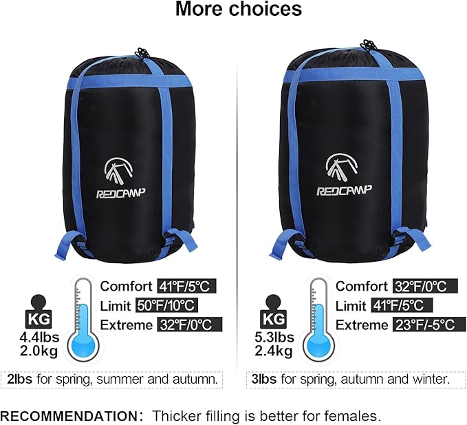 - Temperature Range: 3lbs filling flannel sleeping bags for adults are comfort in 41°F/5°C and fits temperature range 32-50°F/0-10°C. 2lbs filling sleeping bags is comfort in 41°F(0 degree cold weather) and fits temperature range 32-50 °F/0-10 °C. Females are recommended to choose the thicker sleeping bags