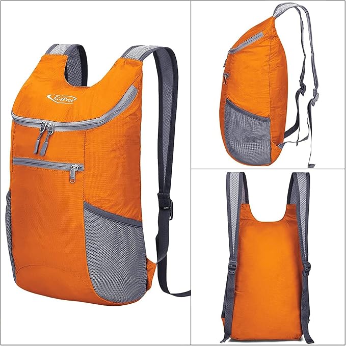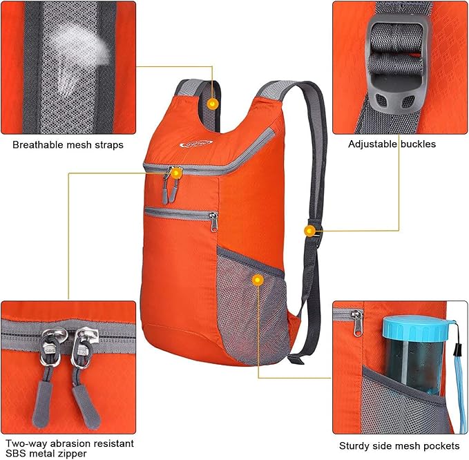 • Keep Things Organized: Foldable hiking backpack has two zippered compartments. The main pocket is large enough to carry travel essentials you need on the trip. The other pocket is great for quick access to items such as cash, credit cards, and passport. Two large sides mesh pockets for water bottles or umbrella