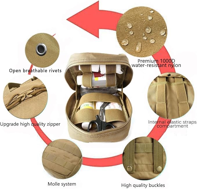 - ✅IDEA DESIGN: Tactical MOLLE EMT Medical First Aid Pouch-Designed with MOLLE belt and strong snap buckle, which allows you to install the medical Pouch on any MOLLE compatible gear without falling.