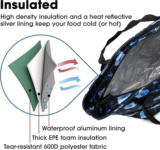 - Insulated — High density insulation and a heat reflective silver lining keeps your food cold (or hot) in this thermal lunch bag