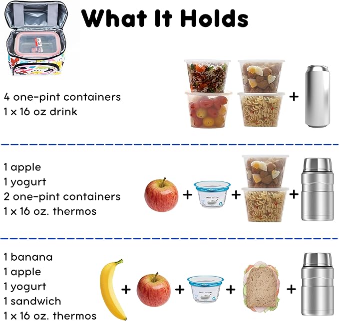 - What It Holds — Insulated lunch box holds a 12-16 oz drink, a yogurt cup, a fruit cup, a small cottage cheese container, an apple, and 2 frozen gel packs