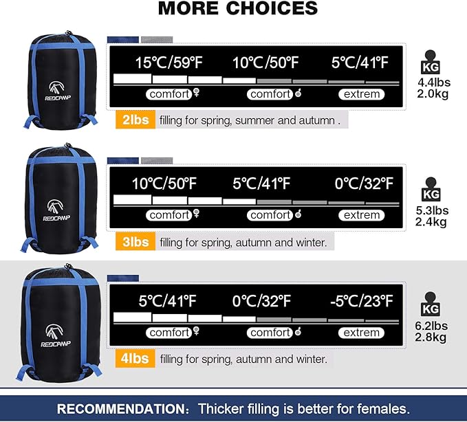 - EXTRA WARMTH: The 80% cotton lined adult sleeping bag is comfortable for different temperatures and is designed with a 2,3 or 4 lbs filling.
