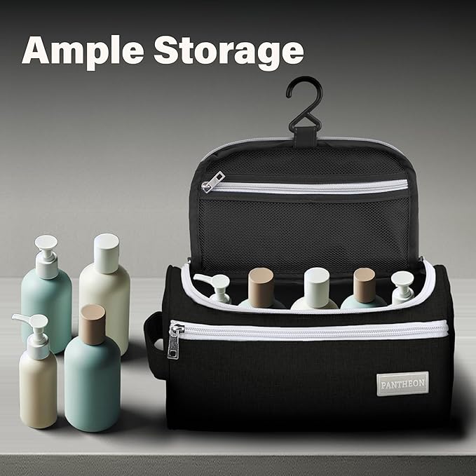 - HIGH-QUALITY DURABLE MATERIAL: This exceptional toiletry travel bag by Pantheon is made of attractive Cationic Oxford cloth, which is known for its lightweight yet durable qualities, the perfect combination for traveling. This specific material is water resistant, making it safe for use in environments where it may become wet, such as a bathroom or shower area. The interior of the bag is securely lined with a special material that can handle accidental toiletry spills and can be easily cleaned t