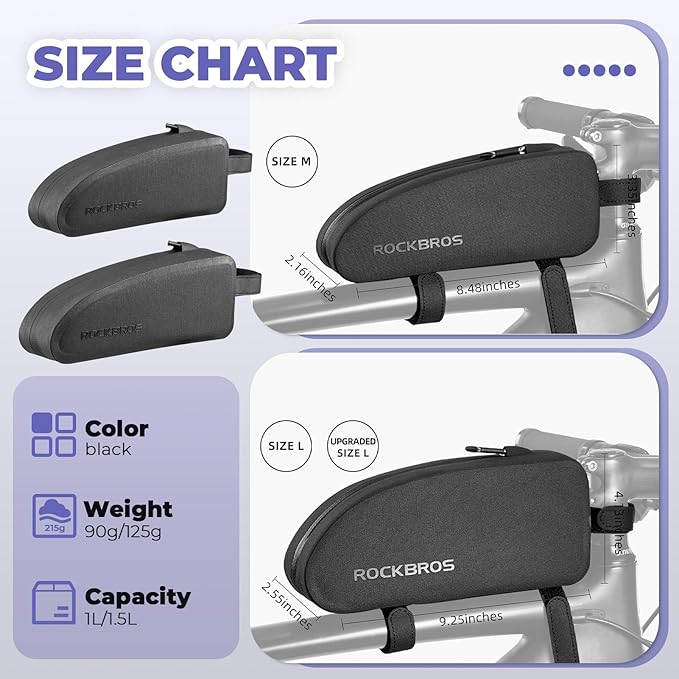 - LARGE CAPACITY: The bike frame bag is big enough to store your wallet, energy gel, inner tube, mobile phone, gloves, repair bike tool, power bank and so on. Size L: 9.25 * 4.13 * 2.55inches, Size M: 8.48 * 3.35 *2.16inches