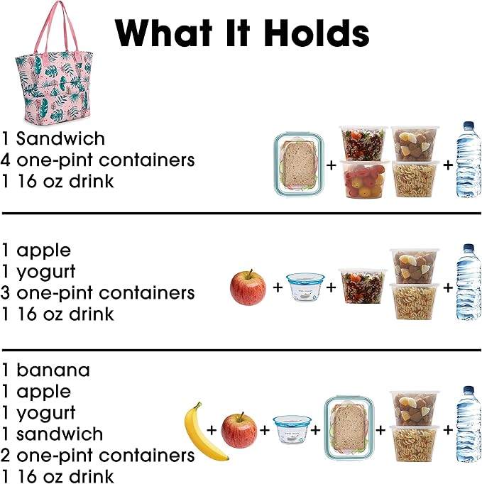 - Packs Typical Lunch — Cooler lunch bag holds a 12-16 oz drink, a yogurt cup, a fruit cup, a small cottage cheese container, an apple, and 2 frozen gel packs