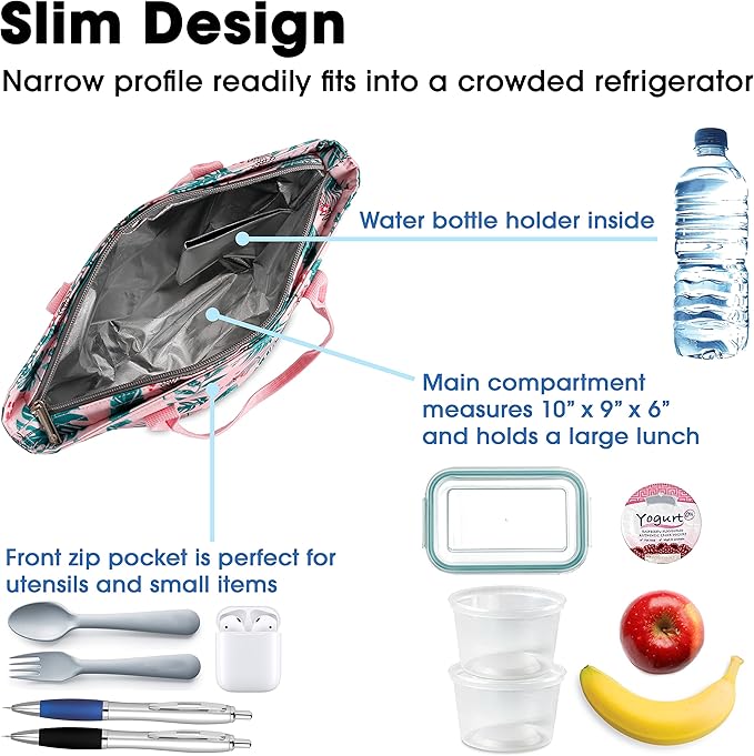 - Fits In Fridge — The narrow profile of this slim lunch box readily fits into a crowded refrigerator at work. For a wider lunch tote, search for “J World New York Casey" or "J World New York Cara"