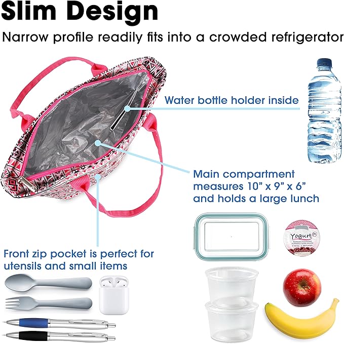 - Fits In Fridge — The narrow profile of this slim lunch box readily fits into a crowded refrigerator at work. For a wider lunch tote, search for “J World New York Casey" or "J World New York Cara"