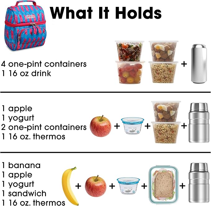 - What It Holds — Insulated lunch box holds a 12-16 oz drink, a yogurt cup, a fruit cup, a small cottage cheese container, an apple, and 2 frozen gel packs