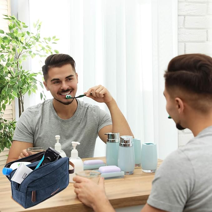 Mactso Mens Travel Toiletry Bag Canvas Leather Cosmetic Makeup Organizer Shaving Dopp Kits with Double Compartments (Blue 1)