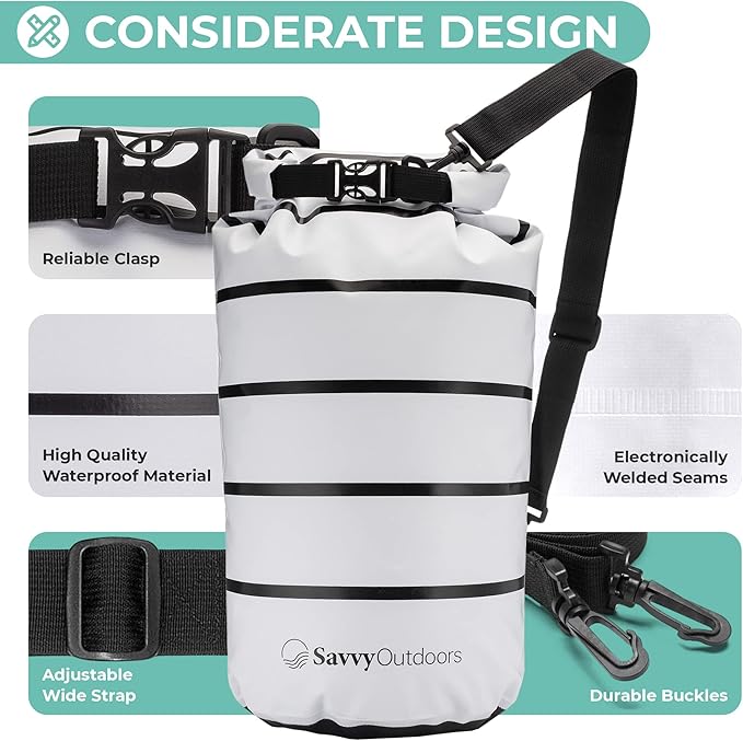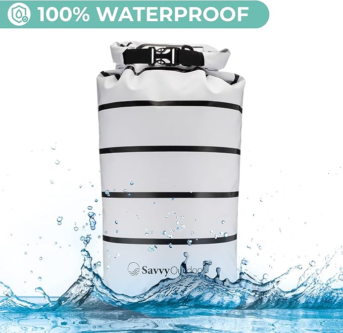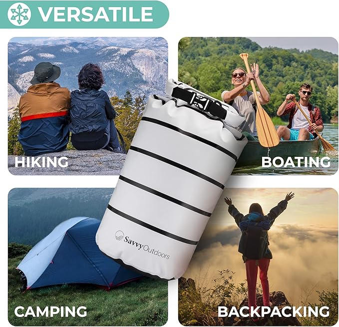 - COMES IN MANY VARIATIONS: Savvy Outdoors waterproof bag for kayaking, camping, and other outdoor trips is a stylish storage solution for your valuables like cellphones, food, and cash. We offer them in 4 sizes from 5 to 30 liters to suit your needs. There are also 5 colors you can choose from.