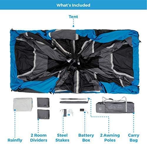 - Included Components : Carry Bag, Room Dividers, Stakes, Battery Compartment, Rainfly