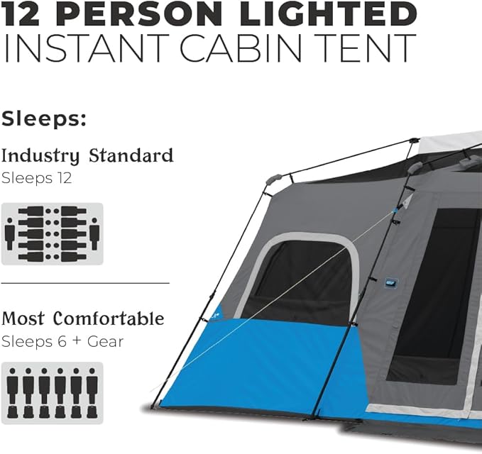 CORE Instant Cabin Tents with LED Lights | 6 Person / 9 Person / 12 Person Family Multi Room Lighted Pop Up Tents for Camping | Included Storage Pockets for Camping Accessories
