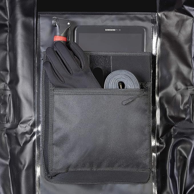 - Made from Heavy Duty 100% Waterproof Tarpaulin with heat welded seams. Small zipped front pocket.