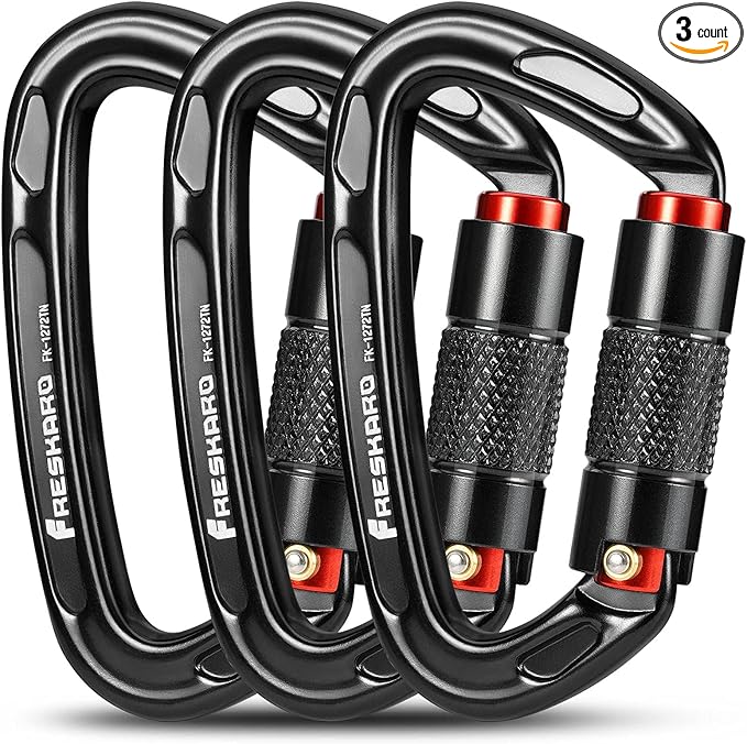 FresKaro UIAA Certified 25KN Auto Locking Climbing Carabiner Clips, Twist Lock, and Heavy Duty Carabiners for Rock Climbing, Rappelling, and Mountaineering, D Shaped 3.93 Inch, Large Size, Black