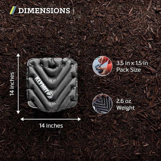 • Compact, Portable Seat Cushion: Our outdoor cushion easily compresses down to 3.5 by 1.5 inches, smaller than a lighter, when deflated, while providing 14 by 14 inches of cushion inflated; Throw this waterproof seat cushion into your backpack and go