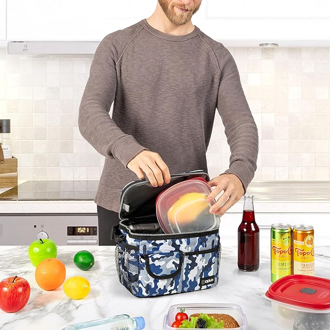 opux Insulated Lunch Bag for Men Women, Leakproof Camo Blue Lunch Box for Work, Portable Soft Lunch Cooler Bag with Shoulder Strap, Adult Lunchbox Lunch Pail for Kid Boy Girl School, 14 Can/8L