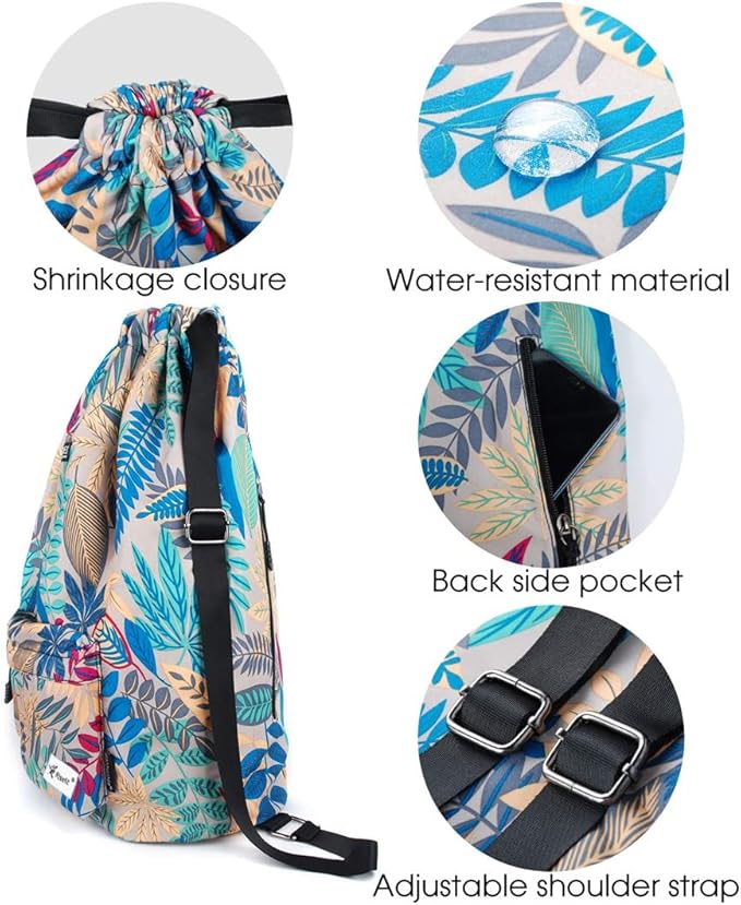 - ADJUSTABLE WIDE SHOULDER STRAPS-- Super wide shoulder straps, adjustable and feels no bulky in wearing. Main compartment with draw cord closure for easy access.