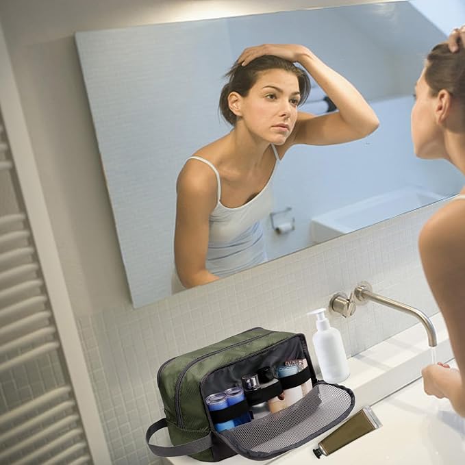 - 【ORGANIZED COMPARTMENTS】 --- Main compartment that holds larger items such as shampoo bottles or shaving cream. One zippered mesh pouch that keeps your smaller toiletries and cosmetics in a place visible and breathable. Other side front zipper pocket that provides extra storage with easy.