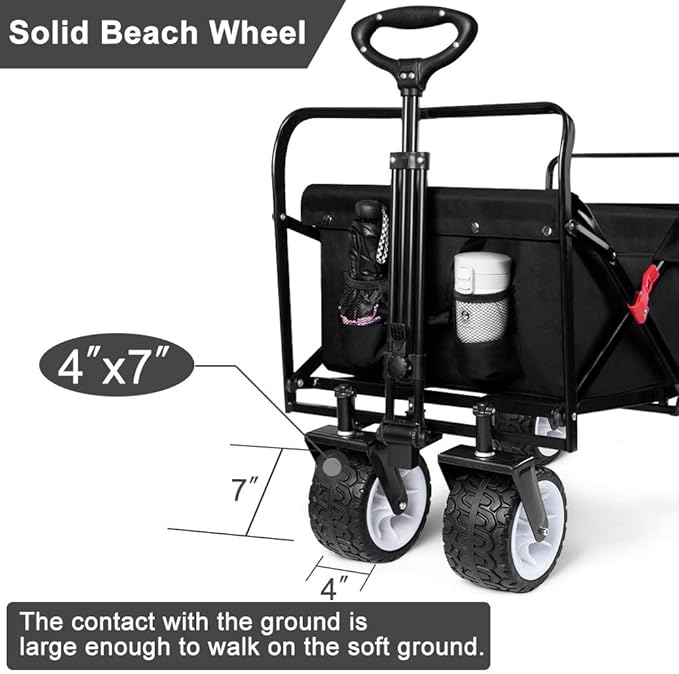 - All Terrain Beach Wheels: Collapsible beach wagon with 4 large 7"x4" double bearings wheels, allowing flexible steering and smooth rolling on uneven terrains such as sand, grass, rocks, pebbles, holes, hills, bumps and mud. The shock-absorption and noise-reduction ensuring durability and resistance to wear and tear.