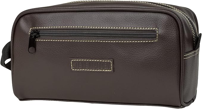 - EXCELLENT STORAGE MEN'S TOILETRY BAG – Steve Madden Mens Vegan Leather Toiletry Bag Travel Kit organizer helps keep your personal items organized featuring one large top zippered pocket, and exterior zippered pocket and an internal zippered pocket.