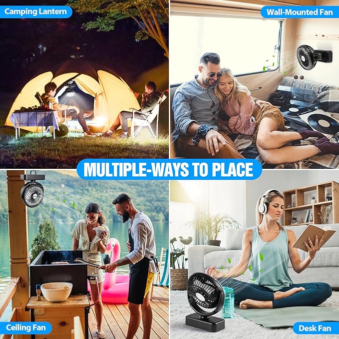 - VERSATILE PLACEMENT: This camping fan has a built-in hook to hang it on the tents, branches or inside a car. It can be mounted on wall as well as simply placed on desk at home or in office. It’s also a great companion for your baby and pets