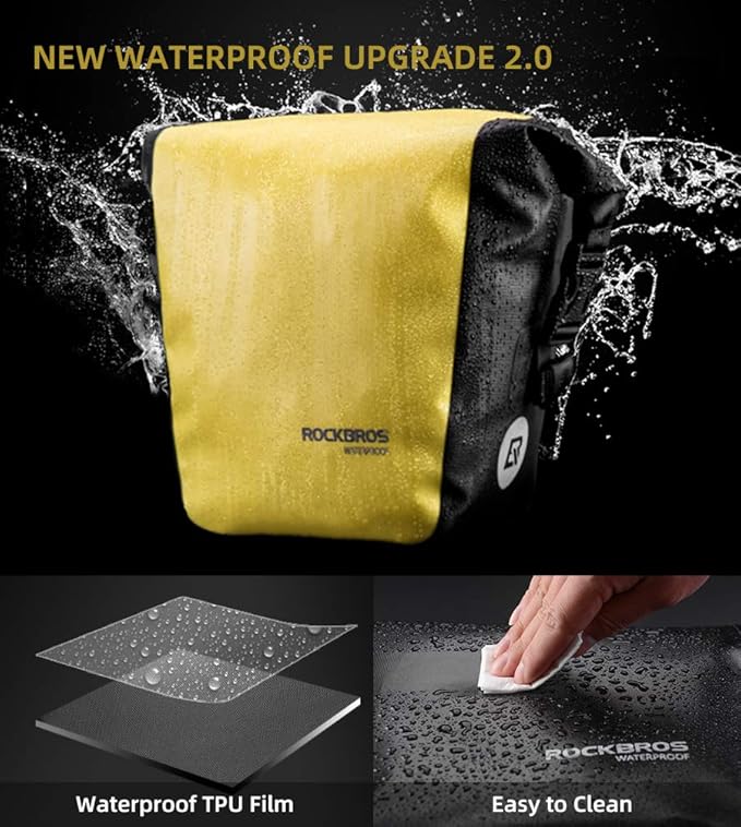 - SEALED WATERPROOF: Made of 840D Nylon material with TPU film shrouded, this bike pannier is waterproof, sturdy and tear resistance.With crimping closure method, opening is not directly in contact with water, and waterproof effect is better than ordinary zipper closure method. Surface mud and water can be easily removed.