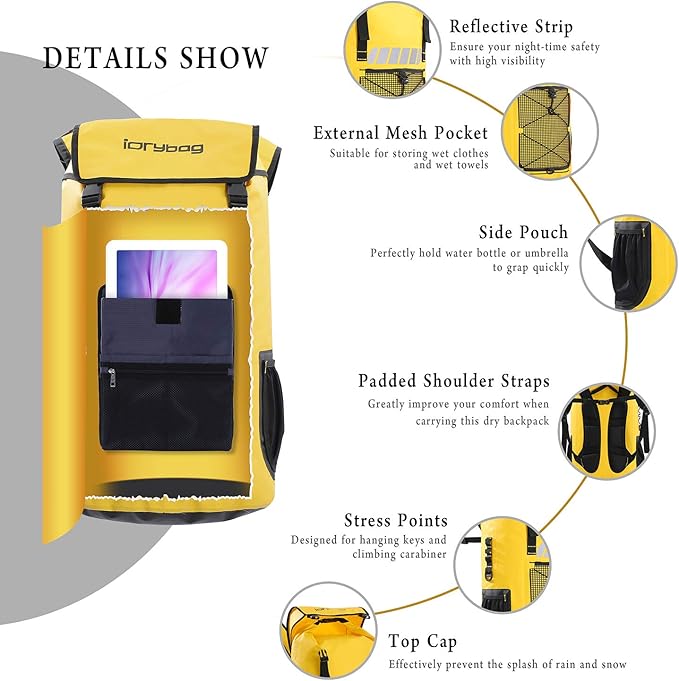 - Scientific Design: Sponge filled shoulder straps greatly improve the comfort when you carry this waterproof backpack. External mesh pocket works well for dry and wet separation. You can store wet clothes and wet towels without dampening the contents of dry backpack. Side pouch is perfect for putting water bottle and umbrella to grab quickly. Besides, we set a reflective strip on this dry bag, which is highly visible and also has a warning effect at night. That means your safety is assured.