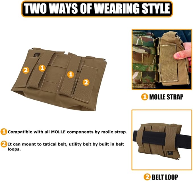 - Two different ways of wearing :1. It can mount to tatical belt, utility belt by built in belt loops. 2.compatible with all MOLLE components by molle strap .Note :If you you don't know how to use molle strap,please check the video we uploaded.