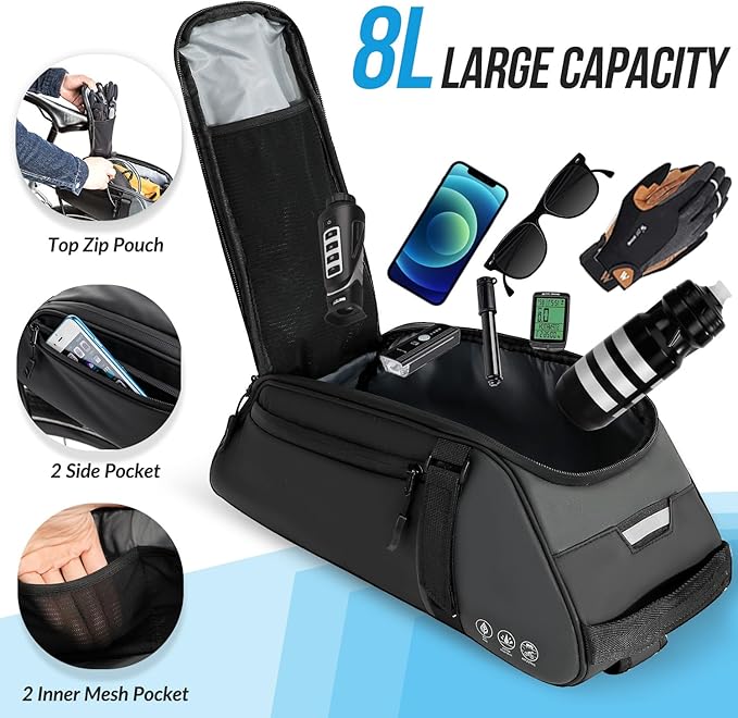 WOTOW Reflective Rear Rack Bag, Water Resistant Bike Saddle Panniers for Bicycles, 8L Trunk Cycling Back Seat Cargo Carrier Storage Pouch With Shoulder Strap for Travel Commute