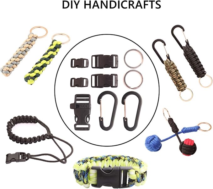 - GeGeDa PARACORD BRACELET KIT: You get 5 - 20 ft or 10 -20feet hanks of commercial grade paracord,2 - 3/8" Black Buckles, 2 - 4/6" Black Buckles,1-3/4” Black Buckle,2-Aluminum Carabiner 2 - 32mm Plated Steel Key Rings