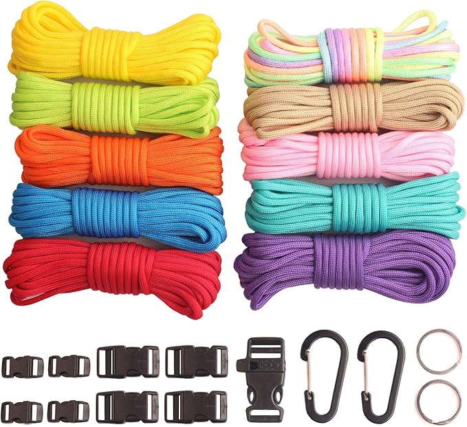 Paracord,Paracord 550 Combo Crafting Kits with 5 Types Buckles,20 Feet Each Paracord Rope (Light Rainbow Set 200feet) (E-Set)