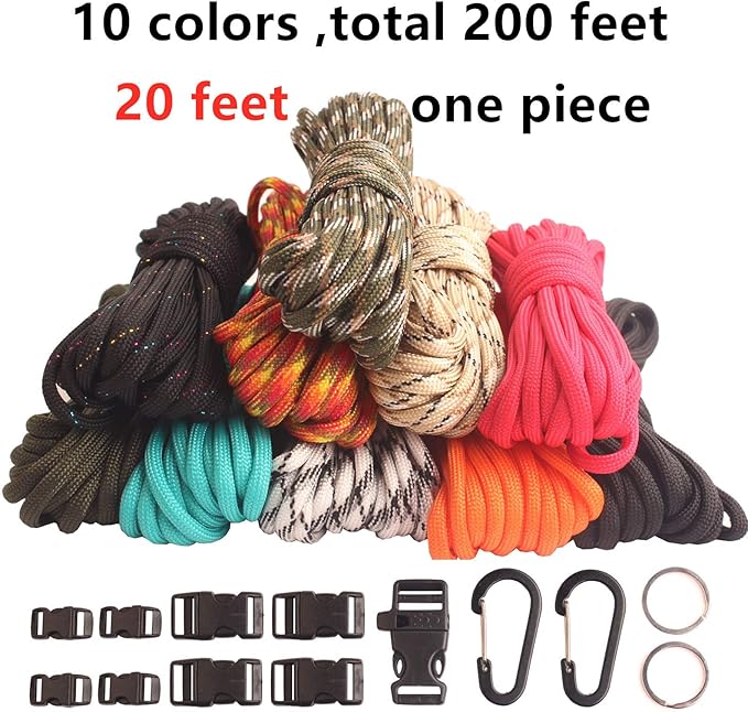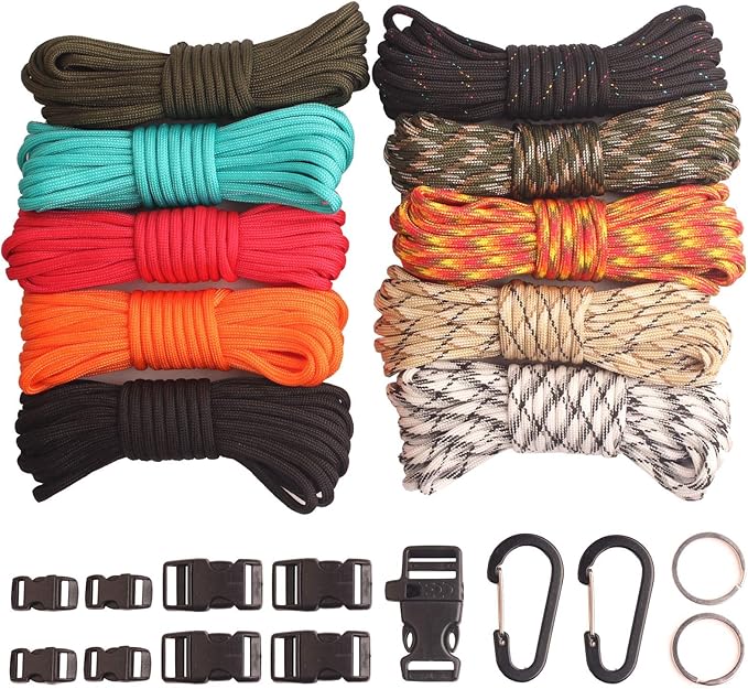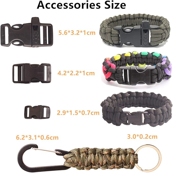 - GeGeDa PARACORD BRACELET KIT: You get 5 - 20 ft or 10 -20feet hanks of commercial grade paracord,2 - 3/8" Black Buckles, 2 - 4/6" Black Buckles,1-3/4” Black Buckle,2-Aluminum Carabiner 2 - 32mm Plated Steel Key Rings