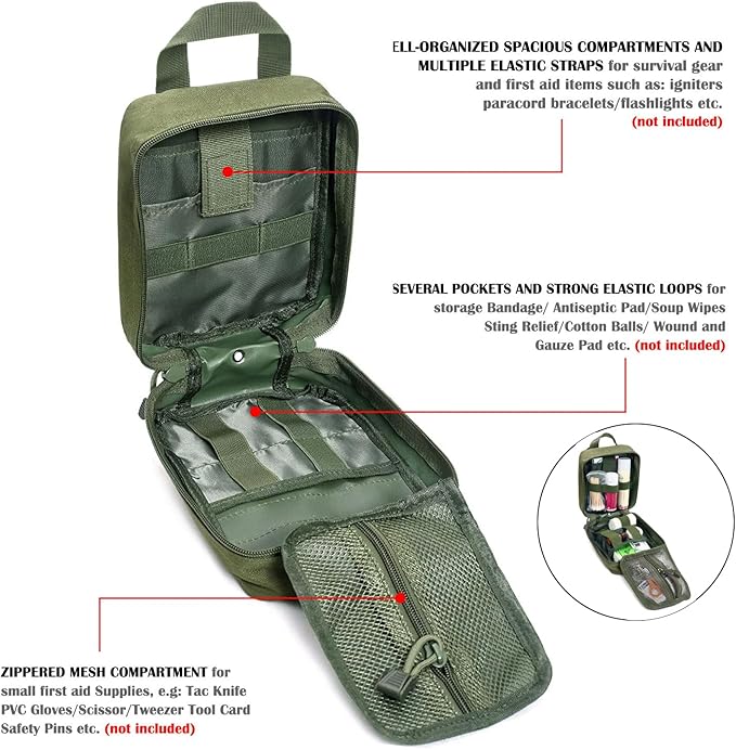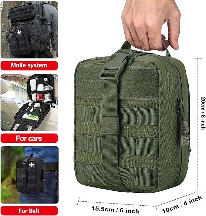 - Tactical first aid bag is military grade Molle compatible tactical medical pouch, compact IFAK Universal Pouch with elastic straps inside.Perfect for carrying medical supplies(Medical supplies do not included!!!.).