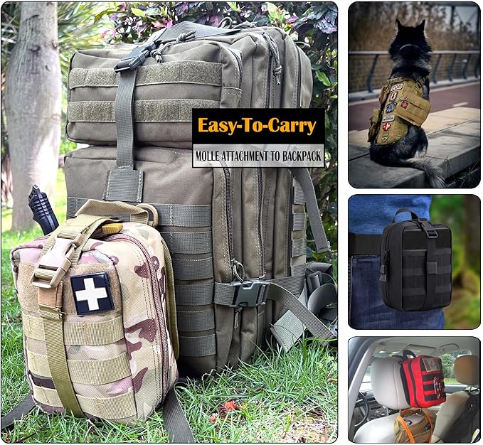 - Strong webbing belt loop on rear, deadly hard wearing & heavy duty. MOLLE attachment straps to be worn on belt, vest or pack etc tactical platform,or put in your car as car first aid kit bag.