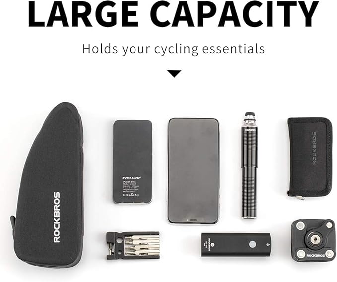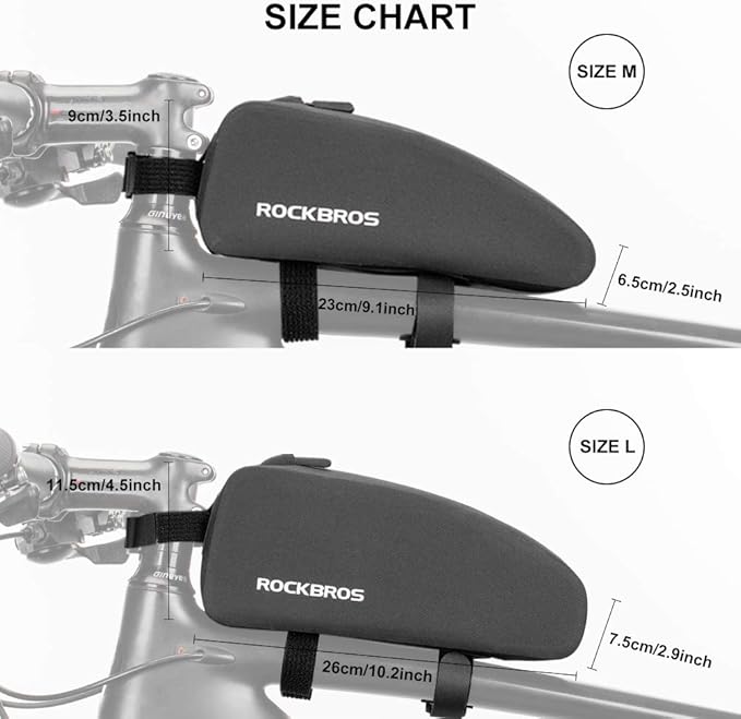 - LARGE CAPACITY: ROCKBROS top tube bike bag is large enough to holds your phone, wallet, keys, energy bar, snacks, gloves, spare tube, tire levers and a multi tool. Medium size could holds under 6.0” phones, Large size could hold under 6.5” phones.