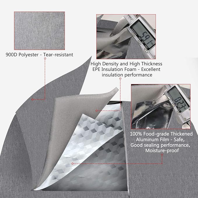 - PREMIUM MATERIAL: Our insulated lunch bag is lined with FOOD-GRADE thickened aluminum foil reflective insulation layer, padded with high density EPE foam, and outlayer is made of premium fabric, The double zippers of the thermal bag are made by SBS, very smooth and durable.