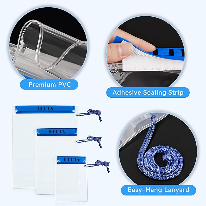 • Different Sizes: The waterproof bags with lanyard contain three sizes: Large: 15.9" x 10.6"; Medium: 12.4" x 7.1"; Small: 9" x 5.1". You can choose different sizes according to your needs
