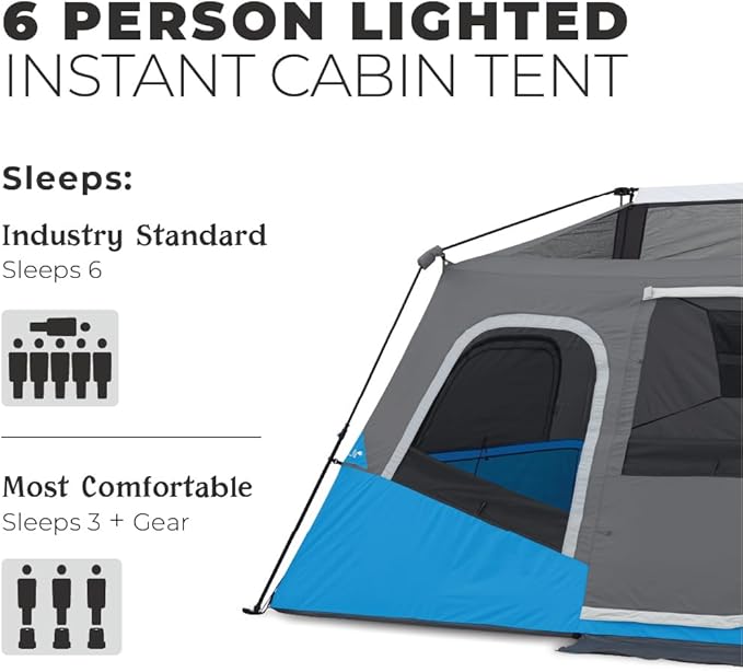 CORE Instant Cabin Tents with LED Lights | 6 Person / 9 Person / 12 Person Family Multi Room Lighted Pop Up Tents for Camping | Included Storage Pockets for Camping Accessories