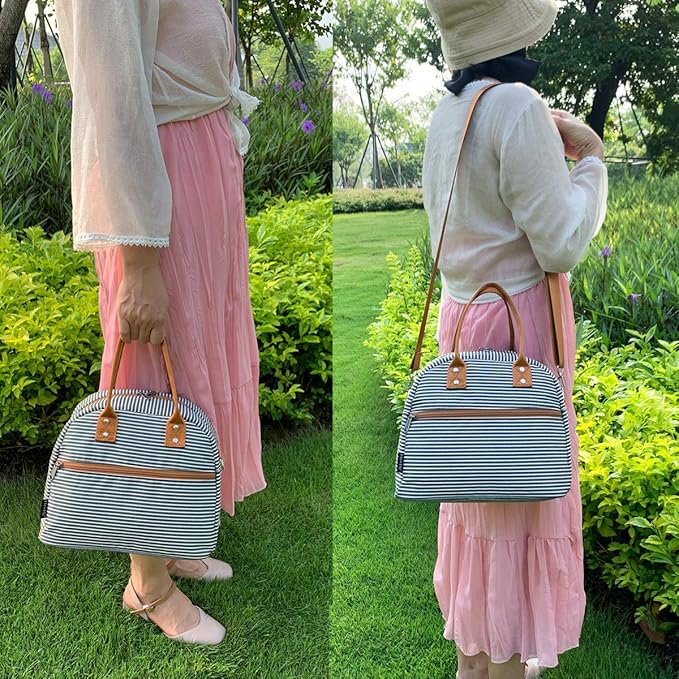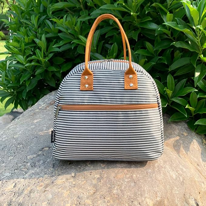 FlowFly Insulated Lunch Bag With Shoulder Strap for Women, Men, and Kids, Large and Reusable, Handle, Freezable Work and School Travel Tote and Meal Prep Organizer,White and Black Stripes