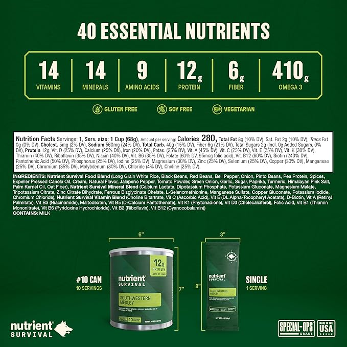 Nutrient Survival MRE Southwestern Medley Ready to Eat Meals (10 Servings) Freeze Dried Prepper Supplies & Emergency Food Supply, 40 Essential Nutrients, Shelf Stable Up to 25 Years, One Can