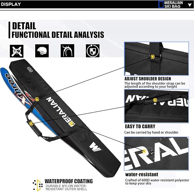 - ★.PREMIUM SKI BAG:Reinforced construction with double stitching and made of 600D water resistant nylon material is used to resist sharp edges and corners and hard rocks.