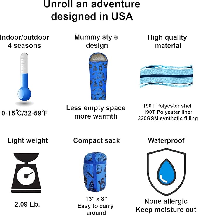- A TRUE 4 SEASON CAMPING SLEEPING BAG (32-59 °F): Unlike other thin sleeping bags, from every step of the design, we kept warmth in mind for our young campers. The mummy style shape reduces unnecessary empty space to keep heat inside. Moreover, the extra draft tube, extra zipper snap, and cozy hoodie all help to keep our customers sleep sound and warm.
