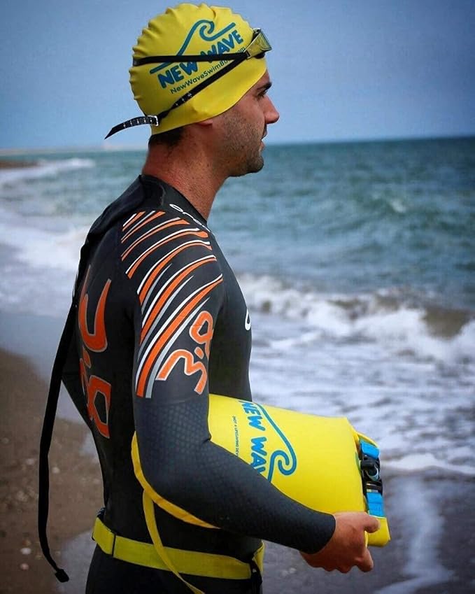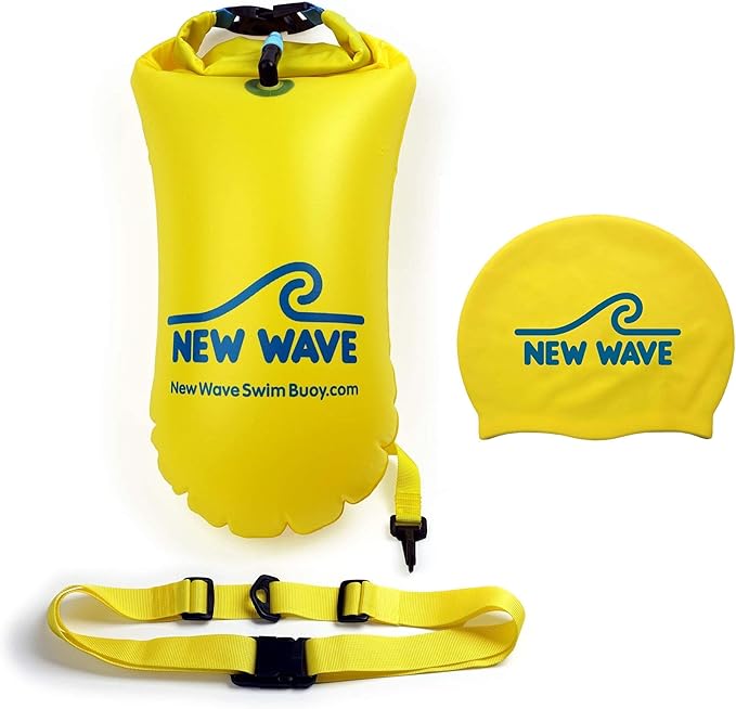 New Wave Swim Buoy & New Wave Swim Cap Bundle - Swim Safety Float and Drybag for Open Water Swimmers Triathletes, Open Water Swim Buoy Float for Safer Swim (PVC 15L Drybag Yellow + Silicone Cap)