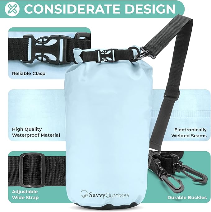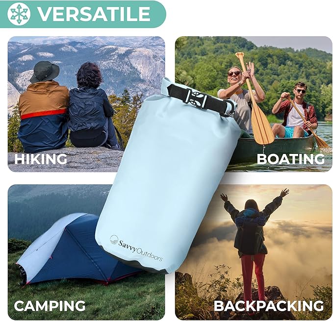 - COMES IN MANY VARIATIONS: Savvy Outdoors waterproof bag for kayaking, camping, and other outdoor trips is a stylish storage solution for your valuables like cellphones, food, and cash. We offer them in 4 sizes from 5 to 30 liters to suit your needs. There are also 5 colors you can choose from.
