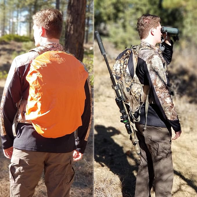 - 2200 cubic inches or 35 Litre capacity overover and 9 big to small compartments with enough space to hold all necessary hunting gears and accessories like camo netting, hunting licence knife led flash light binoculars compass GPS rangefinder camera extra battery turkey duck calls or other accessories and keep them dry