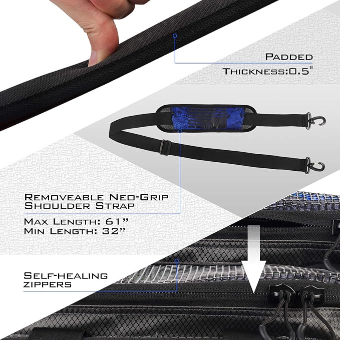 - KEY FEATURES - Store up to (8) 3700 and (4) 3600 size lure boxes with terminal tackle, fishing lures, and fishing tools - Super tough water resistant long-lasting 420D ripstop nylon material - 15 internal and external storage pockets for fishing tackle - Neo-grip anti-slip shoulder bag strap for comfort - Waterproof non-slip compression molded bottom - Resilient no rust, self-healing zippers - Fishing gear dimensions 19.7” x 13” x 10.6”